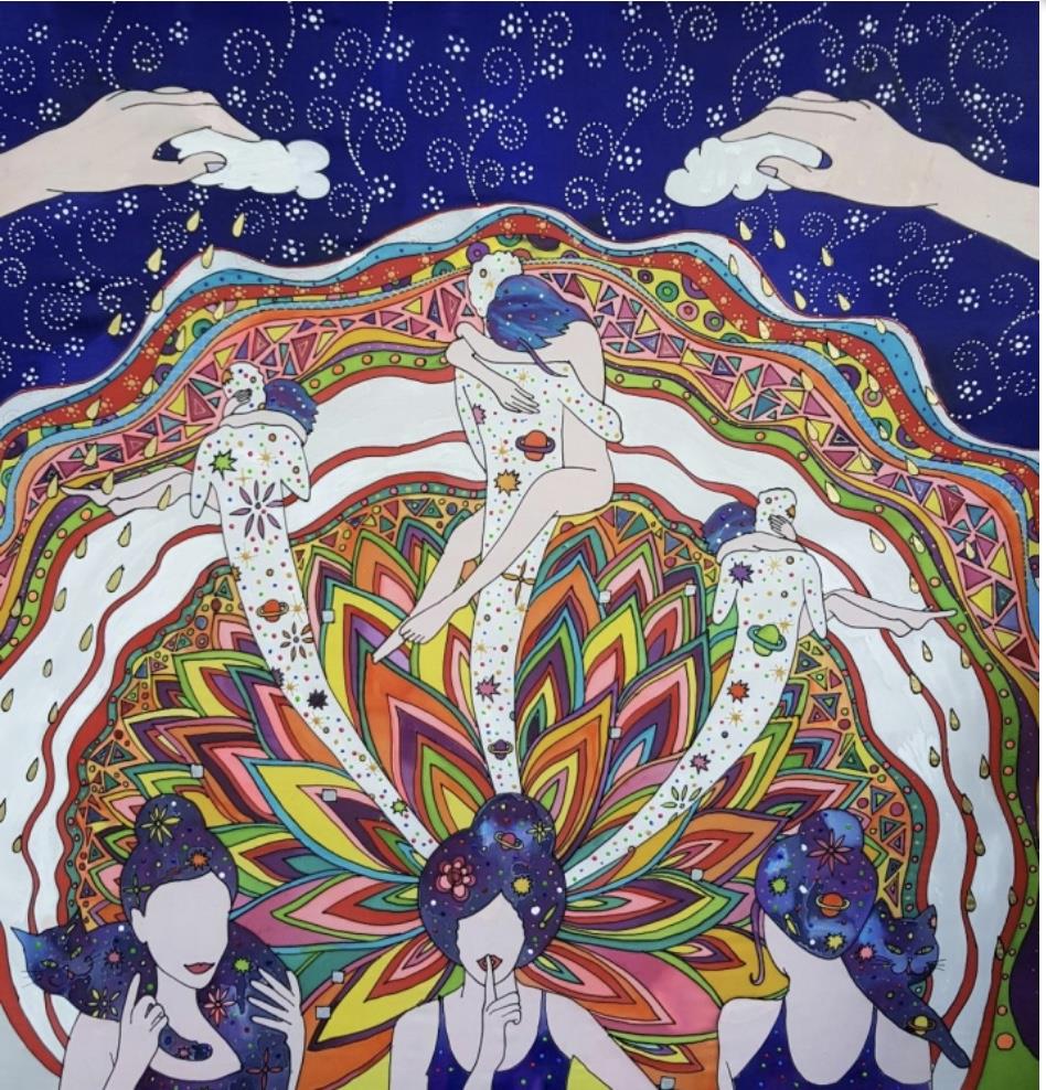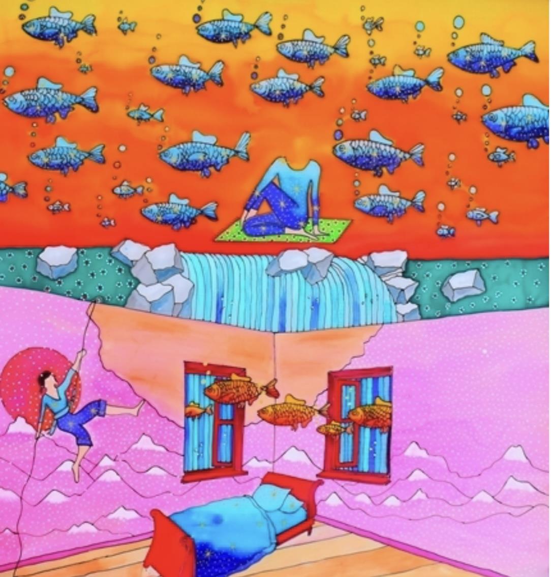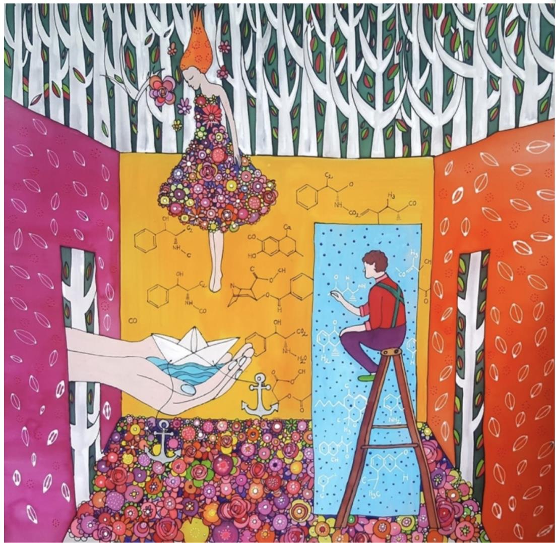 Her unique technique opens a world like a curtain unveiling a theater stage. Réka paints in brilliant hues and explicit lines, using the canvas as a graphic novel. Her art draws one into a playful yet tender world of dreams and symbols of feminine existence.