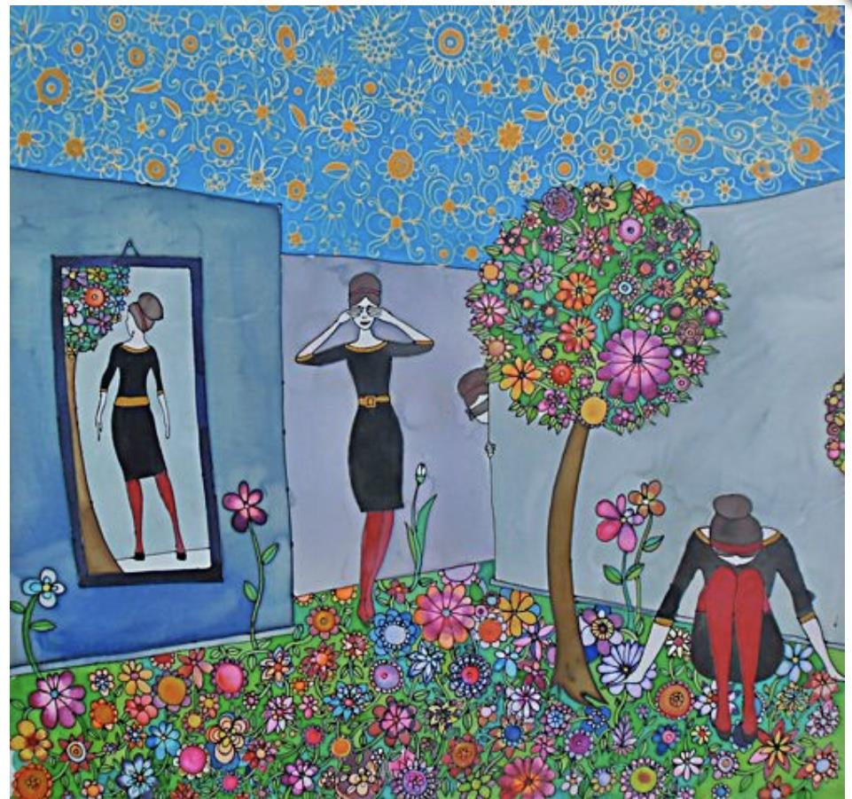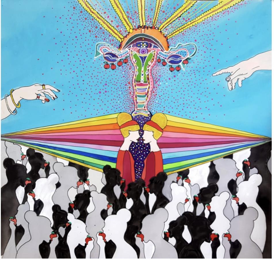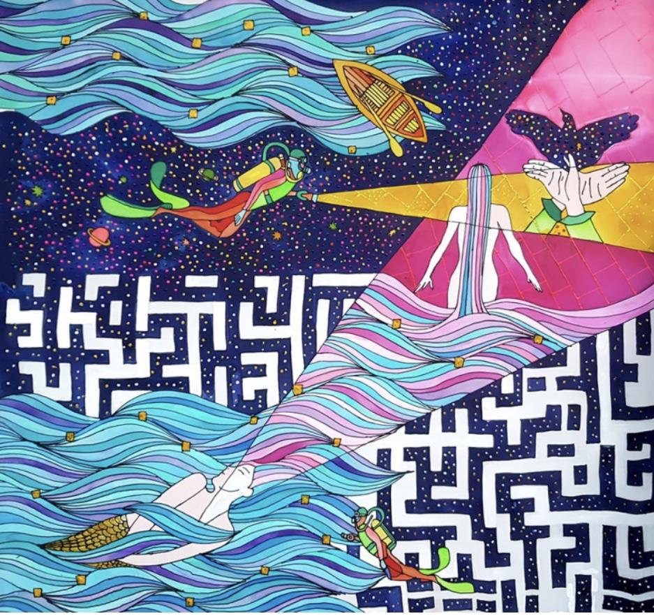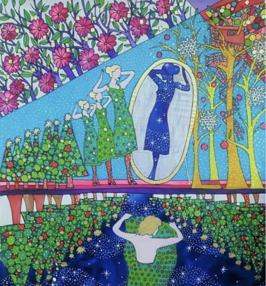 Her unique technique opens a world like a curtain unveiling a theater stage. Réka paints in brilliant hues and explicit lines, using the canvas as a graphic novel. Her art draws one into a playful yet tender world of dreams and symbols of feminine existence.